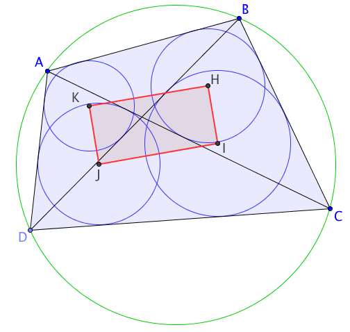 Si H, I, J et K sont respectivement les centres des cercles inscrits dans les triangles ABC, BCD, CDA et DAB, alors le quadrilatère HIJK est un rectangle.